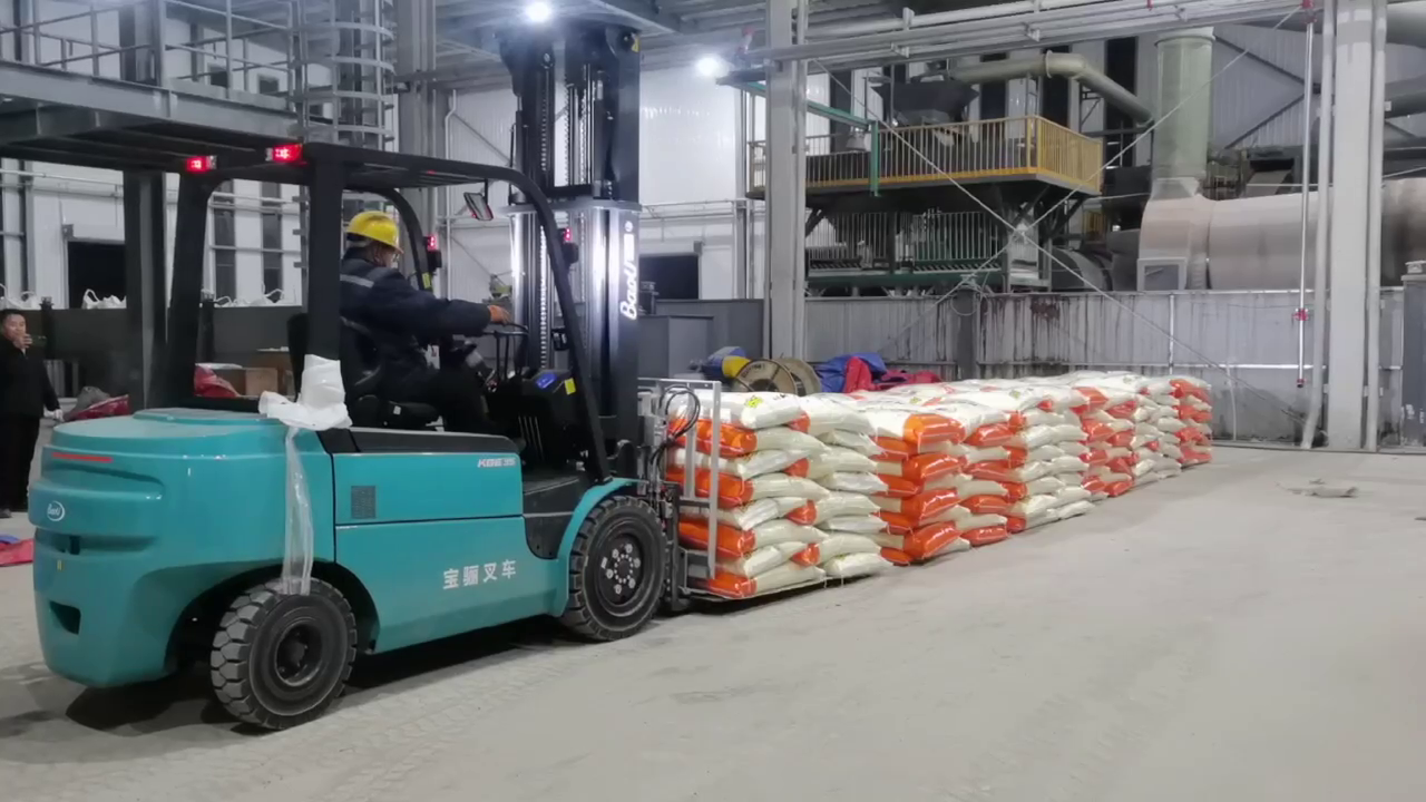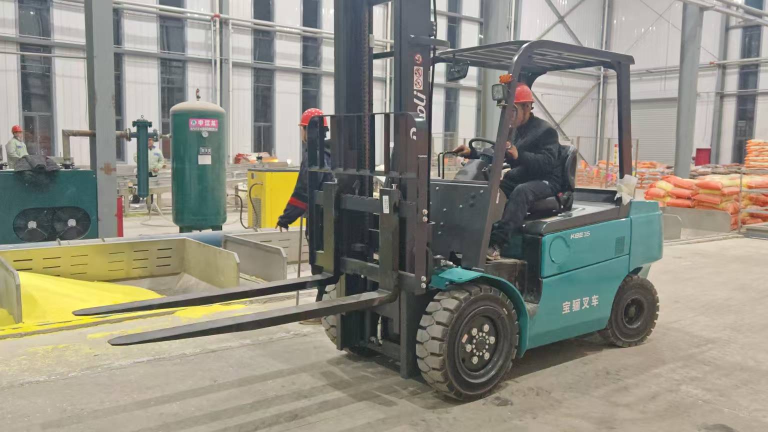 宝骊X3B采用纯电平台设计,以锂电为驱动力,相较传统燃油叉车,具备零排放、超低噪等优势,符合山东省可持续发展政策规定,助客户新工厂在化肥物料转运环节,达成绿色低碳、清洁环保生产搬运目标。